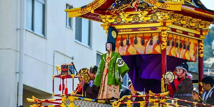 Beautiful, hand-crafted floats parade around the town for two nights and people gather for a traditional harvest celebration. In the evenings, food carts and portable shrines come out in force and there are lanterns and traditional music livening up the streets.