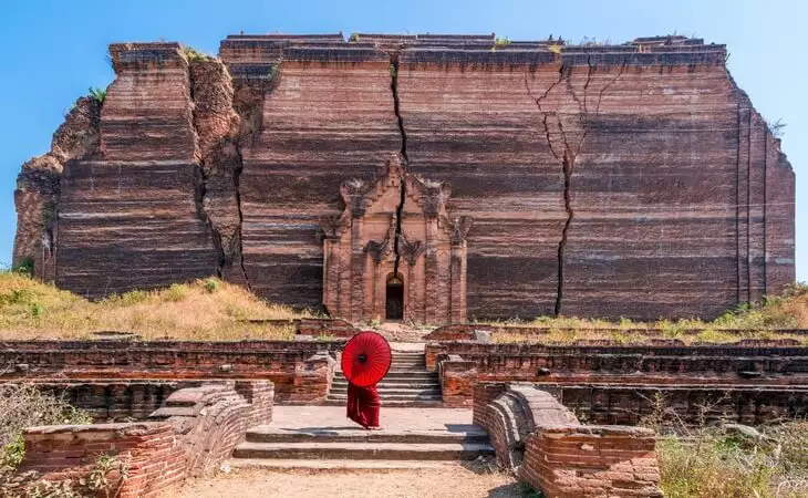 Cruise down the busy waters of the mighty Irrawaddy to admire the huge Mingun Pagoda, a colossal but unfinished temple sat grandly on the river bank.