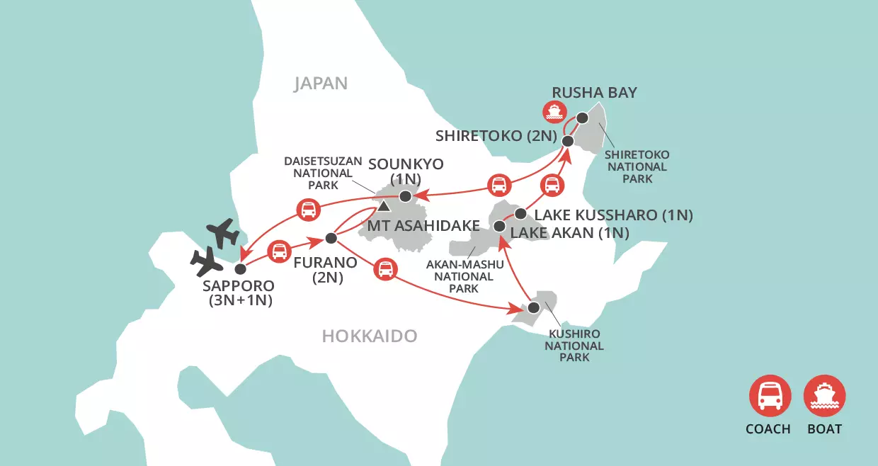 Sapporo (3N) - Furano (2N) - Lake Akan (1N) - Lake Kussharo (1N) - Shiretoko (2N) - Sounkyo (1N) - Sapporo (1N)